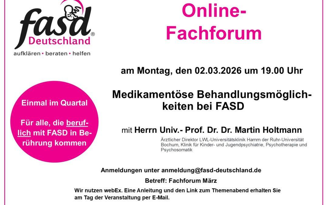 Wir laden herzlich zum online-Fachforum „Medikamentöse Behandlungsmöglichkeiten bei FASD” ein.