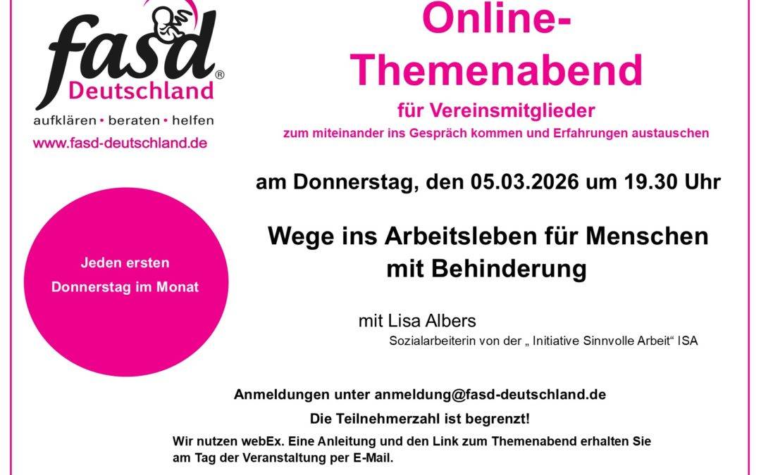 online-Themenabende für Vereinsmitglieder finden jeden ersten Donnerstag im Monat statt. Die Beitrittserklärung finden Sie unter https://www.fasd-deutschland.de/ueber-uns/#unterstuetzung